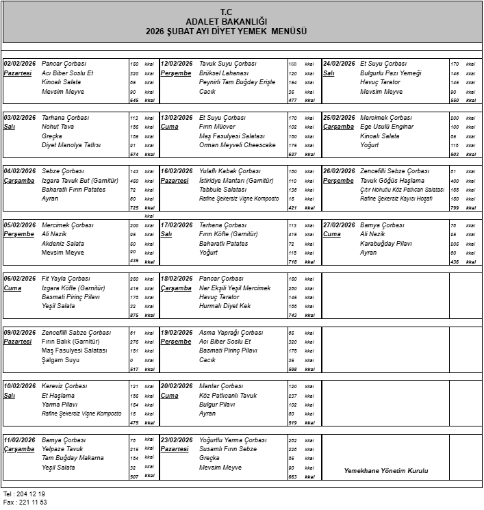 | T.C ADALET BAKANLIĞI 2026 ŞUBAT AYI YEMEK MENÜSÜ |