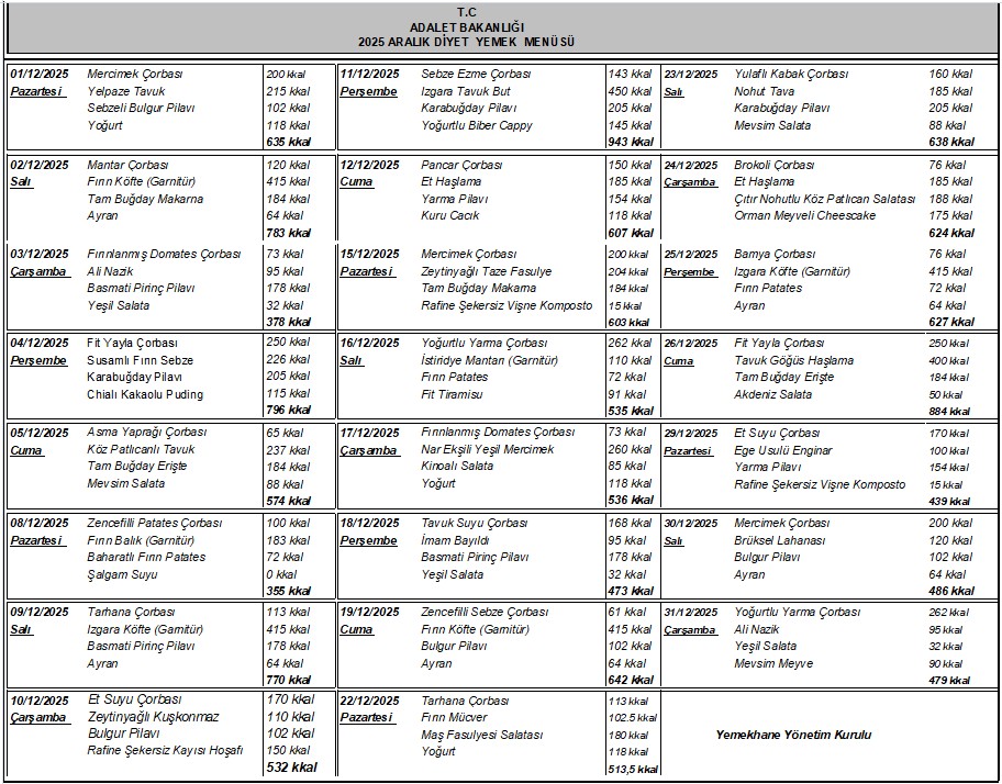 | T.C ADALET BAKANLIĞI 2025 ARALIK AYI YEMEK MENÜSÜ |
